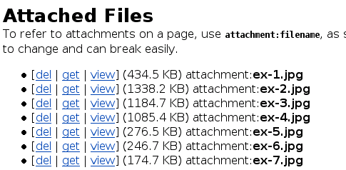 N'utilisez pas les URL du lien [get] de la page permettant l'ajout de pièces-jointes. Ces liens sont amenés à changer régulièrement et peuvent être rendus obsolètes par un reparamétrage du wiki. Pour faire référence aux pièces-jointes d'autres pages, utilisez [[attachment:NomWiki/nomdufichier.ext]].